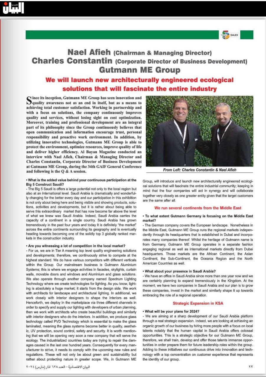 Spotlight on Innovation at Gutmann ME Group! Delighted to share our feature in the March-April 2024 edition of Al Bayan Magazine, Issue 628. Gain insights into the visionary leadership of our Chairman & Managing Director, Nael Afieh and our Corporate Director BD, Charles Constantin as they steer Gutmann ME Group towards new frontiers in architectural engineering and ecological solutions.